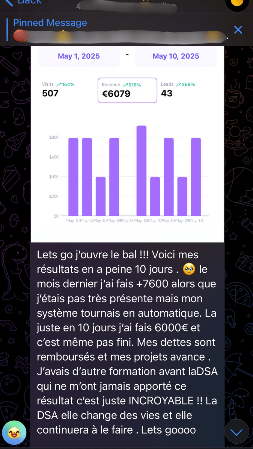 . Le programme DSA est une formation qui t'apprend à construire ton propre business digital avec méthode. En bonus, tu as un droit de revente complet (MRR) du programme DSA : tu peux ainsi le proposer à ton tour, et conserver 100% des bénéfices réalisés.