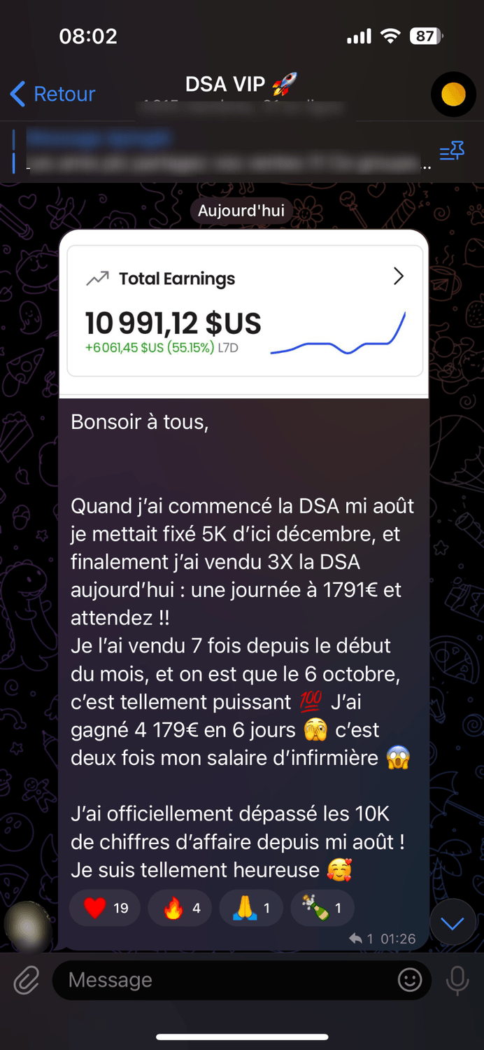 Tu as le choix : Créer et vendre ton propre produit digital unique. Revendre la DSA et garder 100% de chaque vente. Utiliser les 17 produits PLR prêts à l’emploi pour démarrer rapidement. Bref : tu n’es pas enfermé, tu peux choisir la voie qui te correspond.